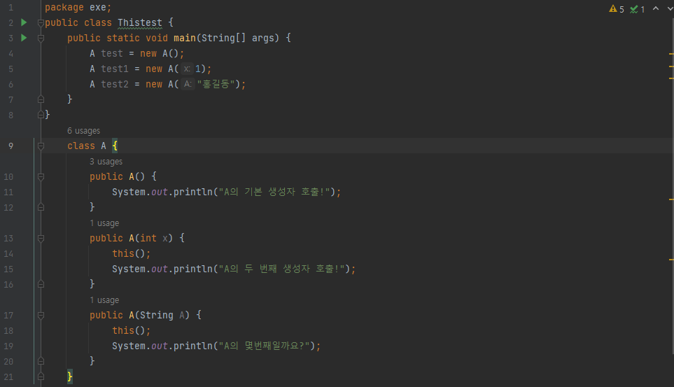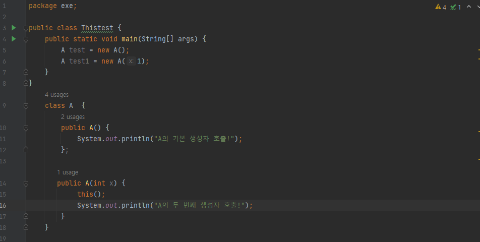 - 자기 외의 생성자 A() 와 A(int x)를 전부 출력하는 것을 확인할 수 있다