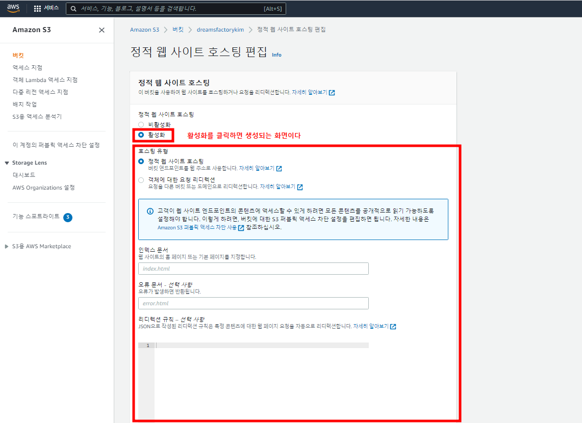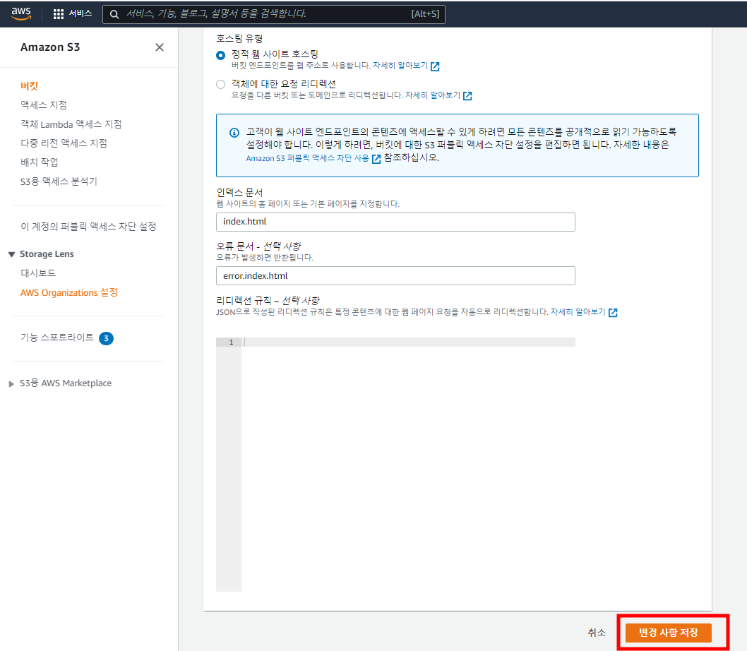 - 생성한 버킷을 정적 웹 사이트 호스팅 용으로 구성한다