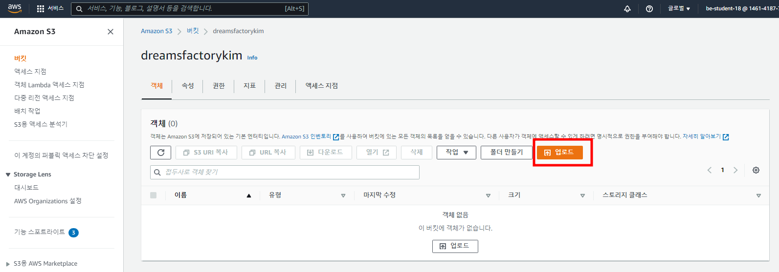 - 객체 메뉴로 이동하여 '업로드' 버튼을 클릭한다