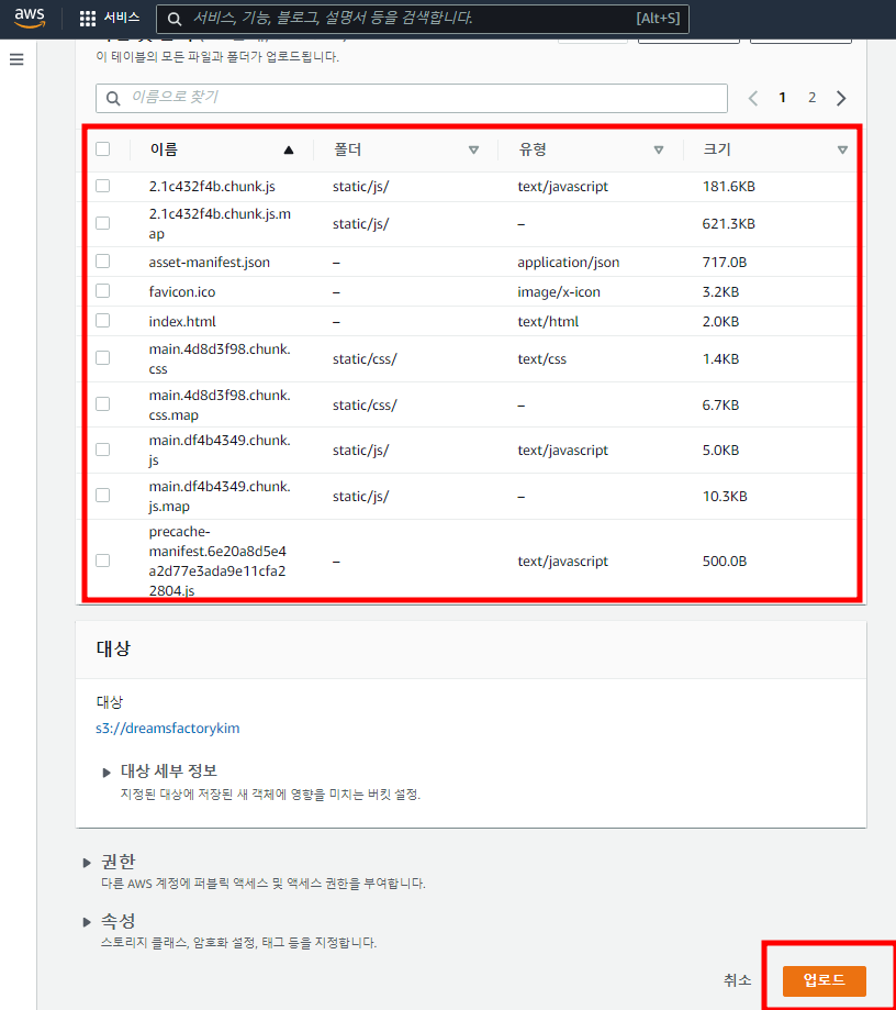 - build 폴더 안에 있는 파일들이 업로드 대기 목록에 추가되었으면 '업로드' 버튼을 클릭한다