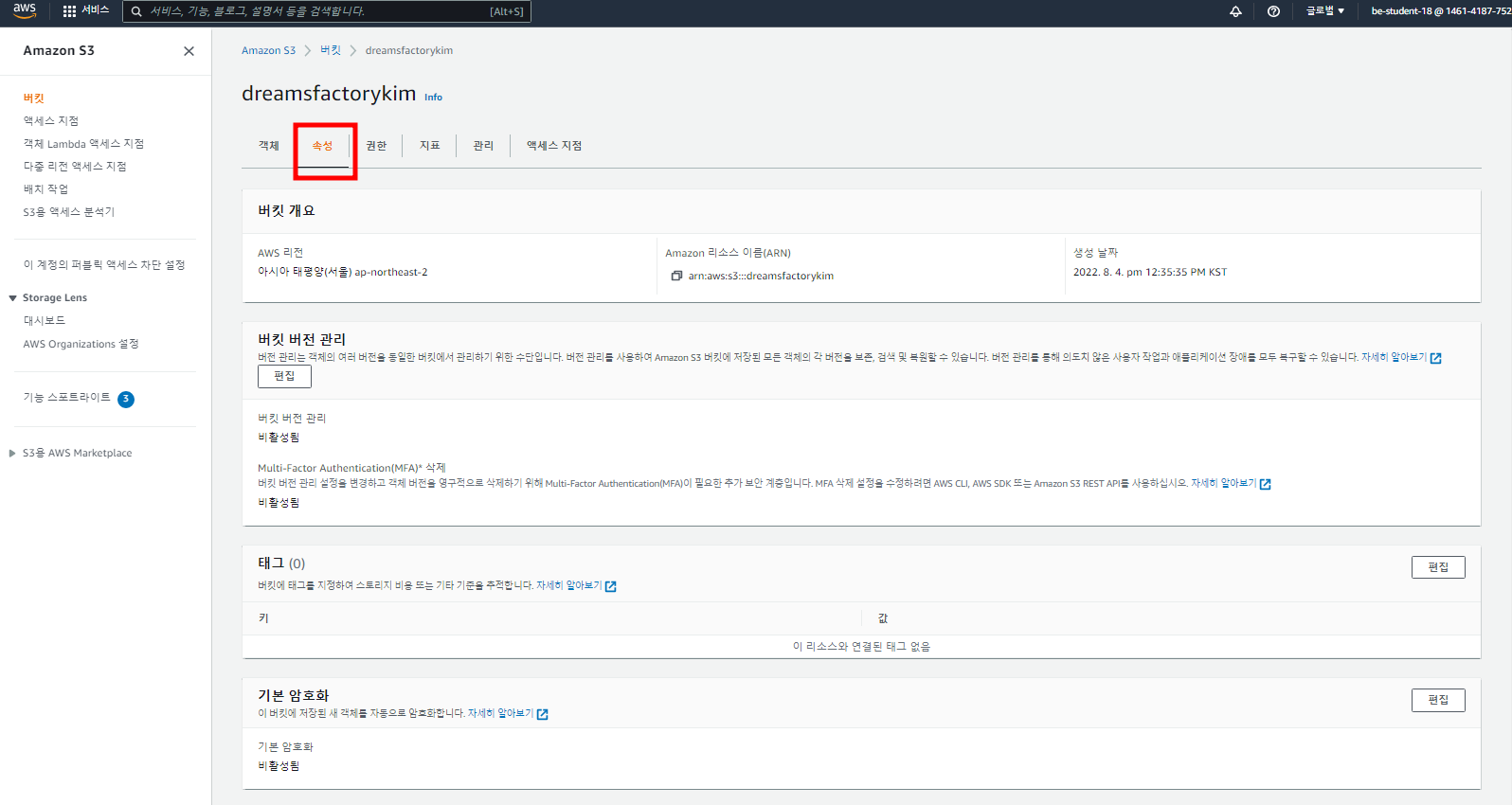 - S3 메인 화면으로 이동하여 생성한 버킷을 클릭한다