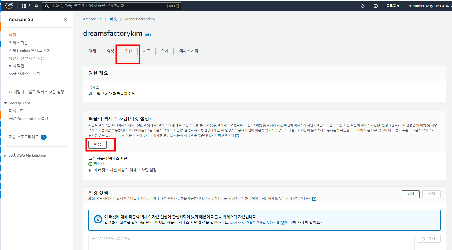 - 퍼블릭 액세스 차단(버킷 설정) 옵션 밑에 있는 '버킷 정책' 옵션을 찾아서 '편집' 버튼을 클릭한다