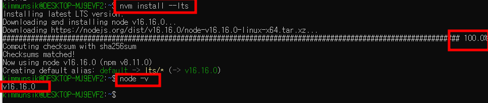 - nvm을 찾을 수 없다는 에러가 발생하여 다시 설치한 후 아래 명령어를 실행했다
