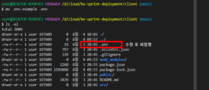 - 파일 수정 명령어는 mv .env.example .env 이다
