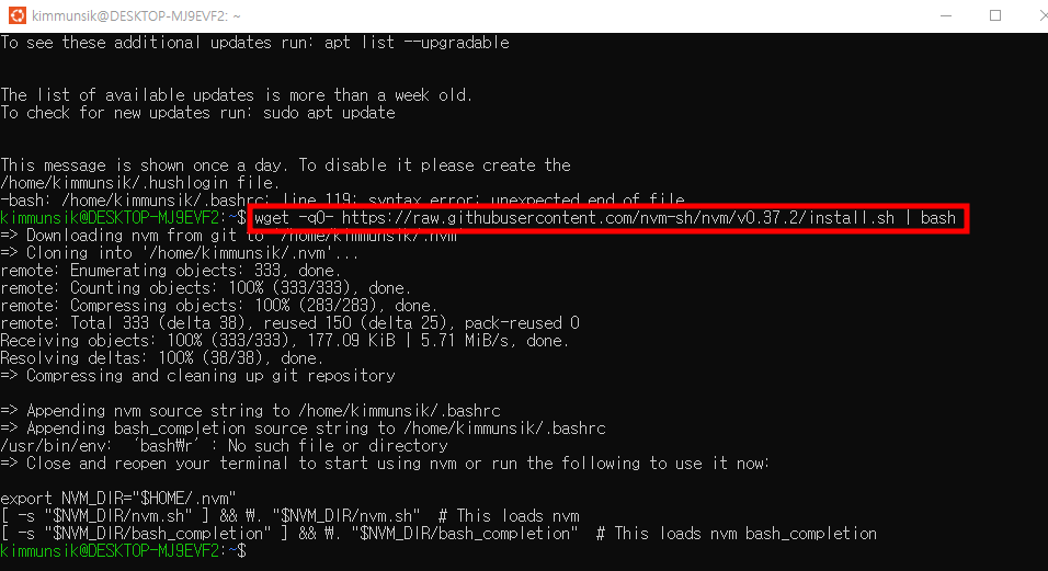 - Close and reopen your terminal to start using nvm or run the following to use it now(터미널을 닫았다가 다시 열어 nvm 사용을 시작하거나 다음을 실행하여 지금 사용하십시오.)
