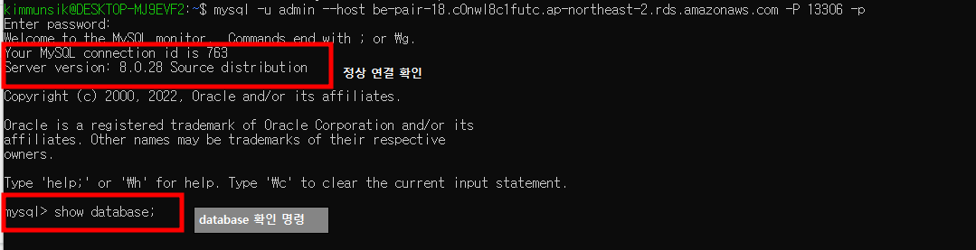- 해당 명령어를 입력하면 비밀번호를 요구하는데, 마스터 비밀번호를 입력하면 된다 - 명령어와 비밀번호를 바르게 작성했지만 접속이 되지 않는 경우 생성한 RDS 인스턴스의 보안그룹을 확인하여 인바운드 규칙에 접근하려는 IP(혹은 모든 곳에서 접근 허용)가 추가되어있는지 확인한다
