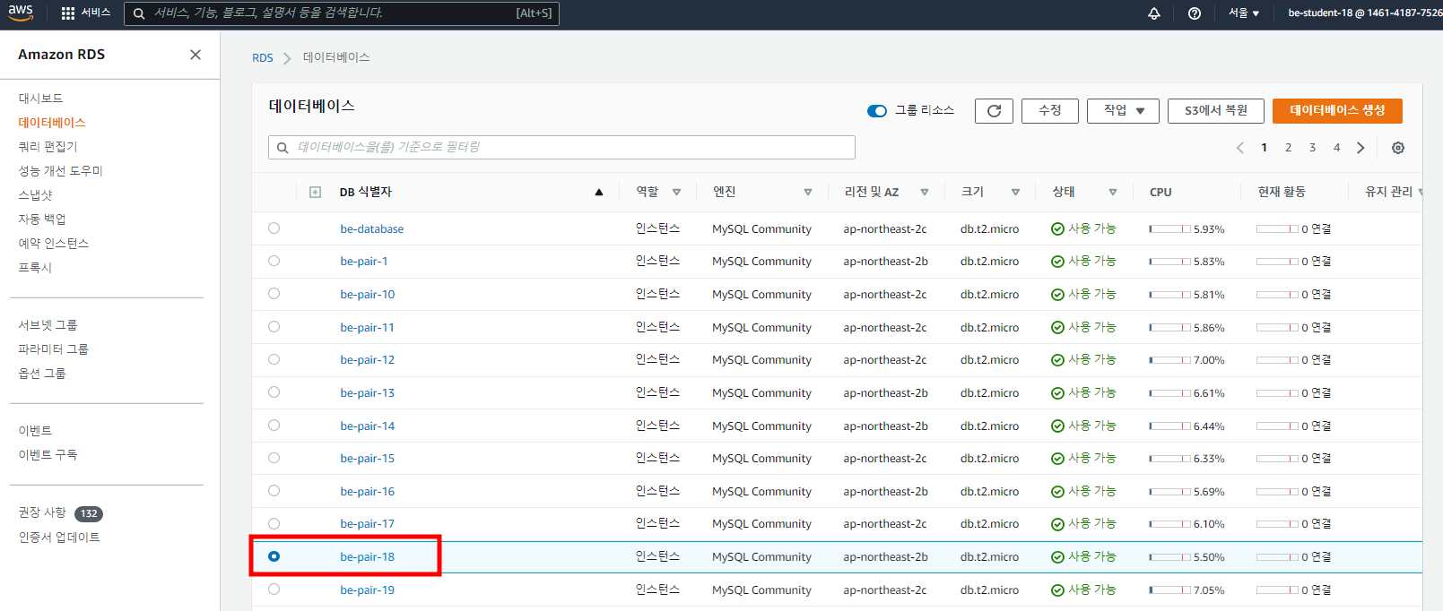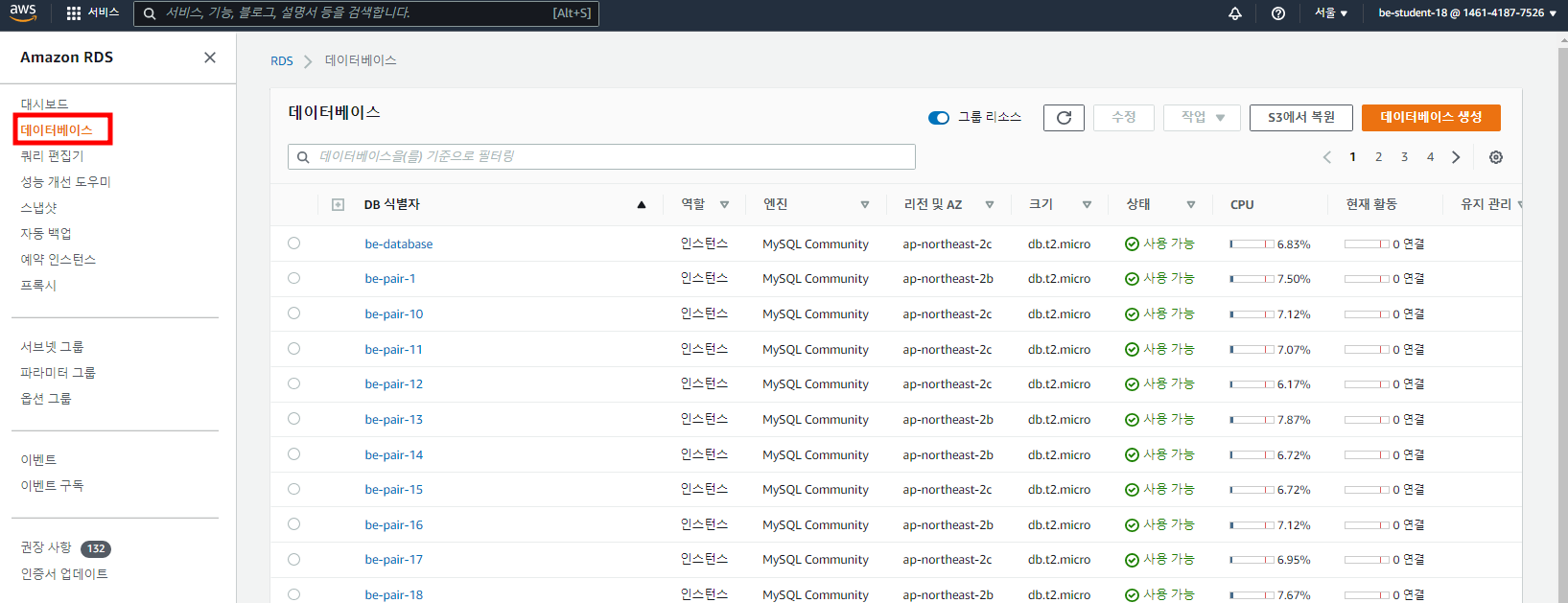 - '사용 가능'으로 변화하면 DB 인스턴스 생성이 완료된다