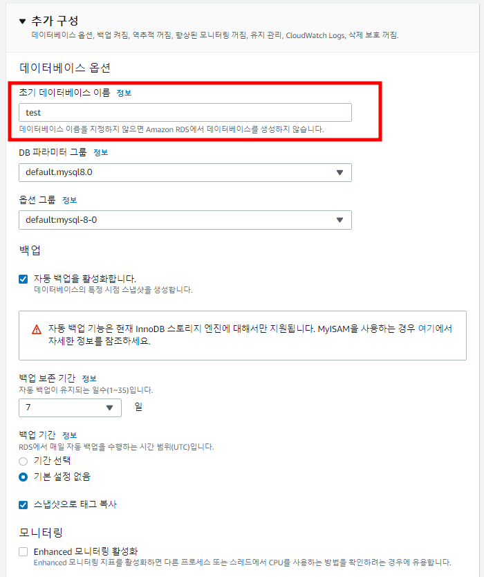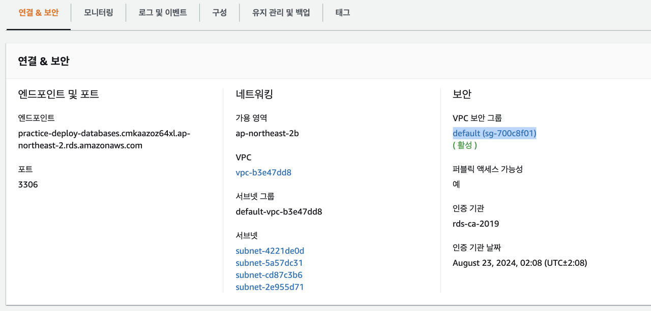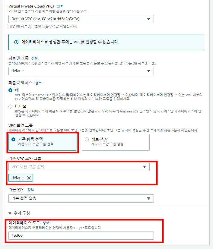 - VPC 보안 그룹 설정은 기본 항목 선택, 기존 VPC보안 그룹은 default를 설정한다