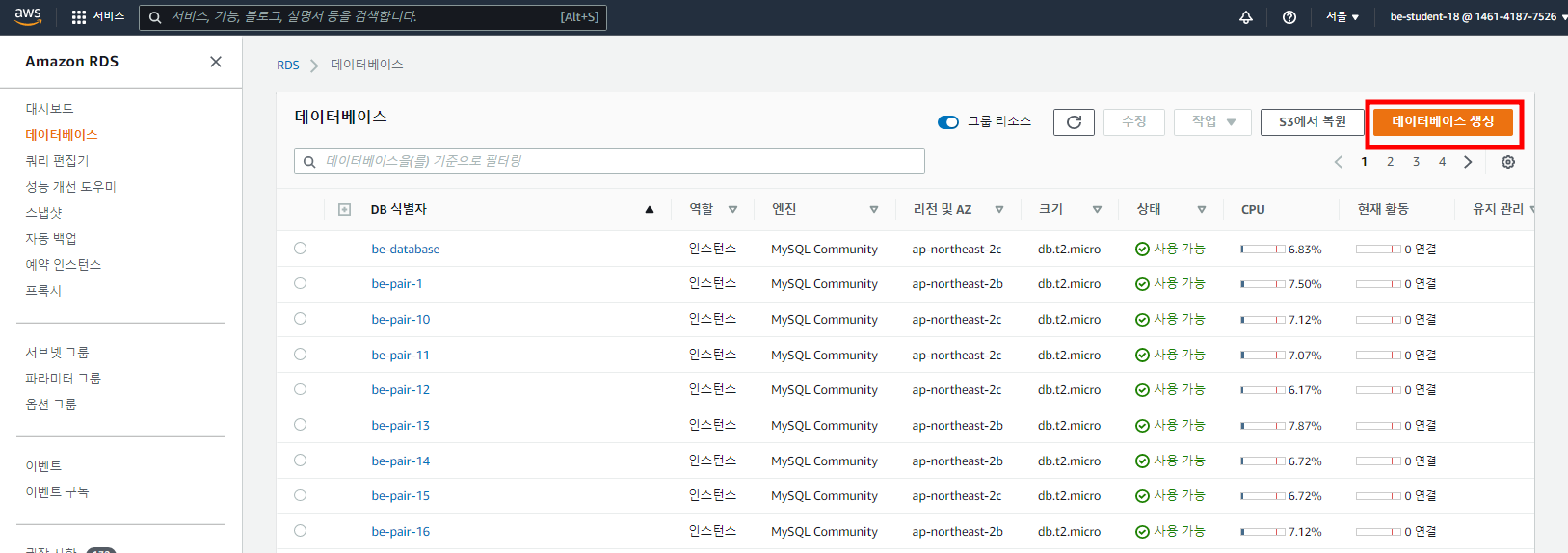 - AWS 메인 콘솔 창에서 RDS를 검색하여 RDS 메인 화면으로 이동한다