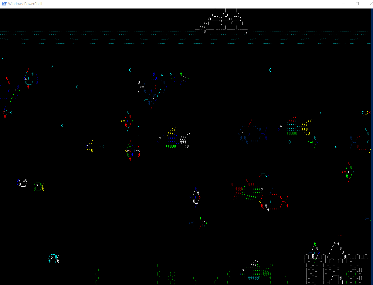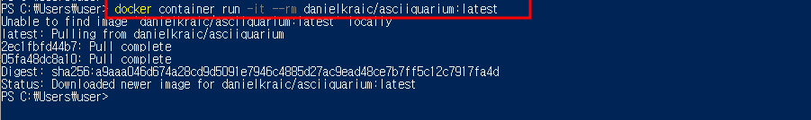 - [커맨드] danielkraic/asciiquarium 이미지를 실행합니다.