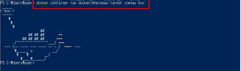 docker container run --name 컨테이너_이름 --rm docker/whalesay cowsay boo
