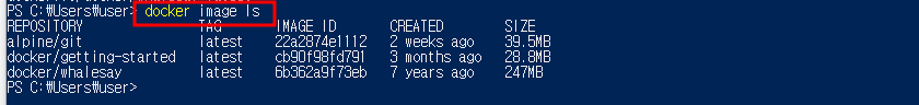 - docker image ls 명령어로 이미지가 만들어진 것을 확인한다