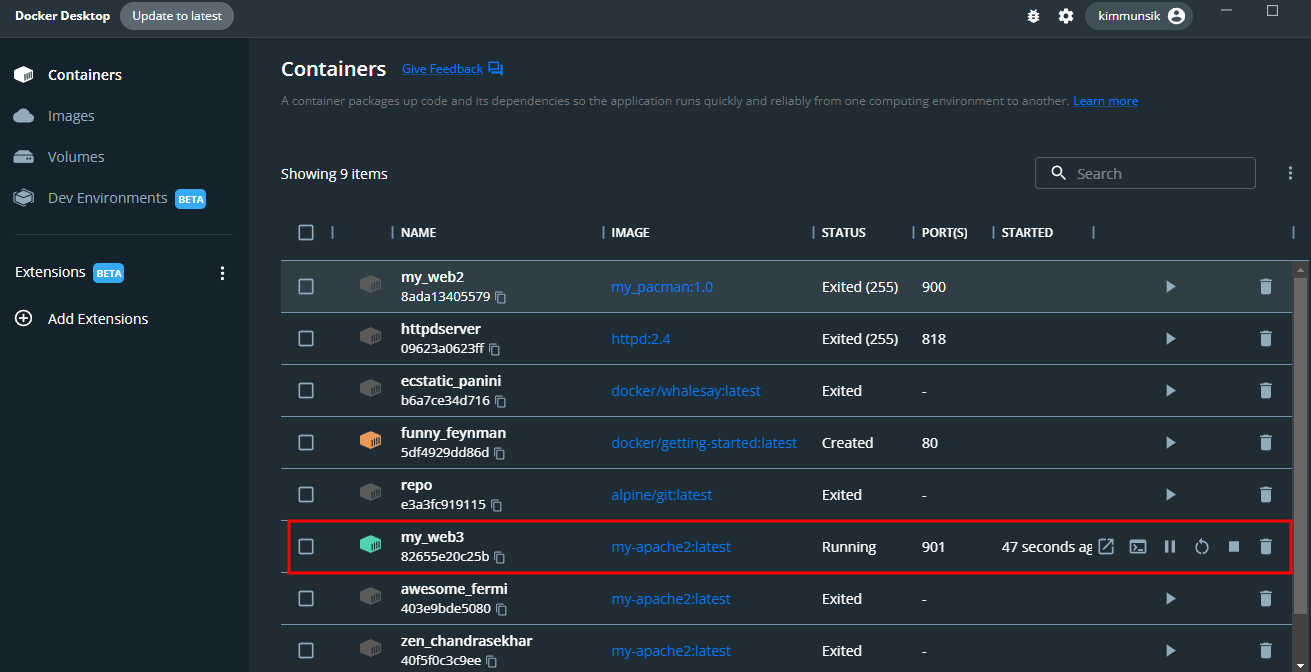 - Docker Desktop 에 my_web3 이름으로 port 901 이 생성됭 것을 확인할 수 있다