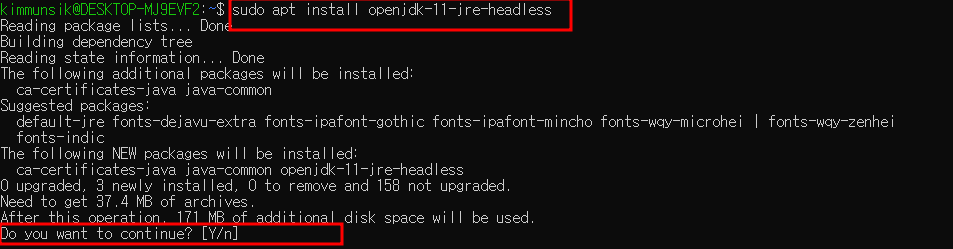 - 'Do you want to continue?' 확인창이 나올경우 "Y"를 입력한다
