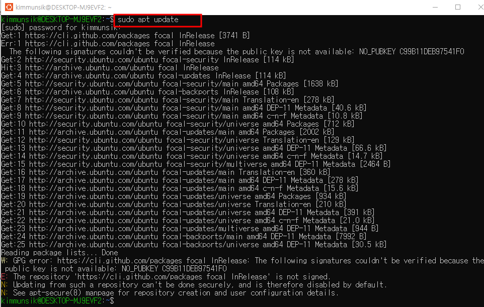- 패키지 매니저가 관리하는 패키지의 정보를 최신 상태로 업데이트하기 위해서 아래 명령어를 터미널에 입력합니다.