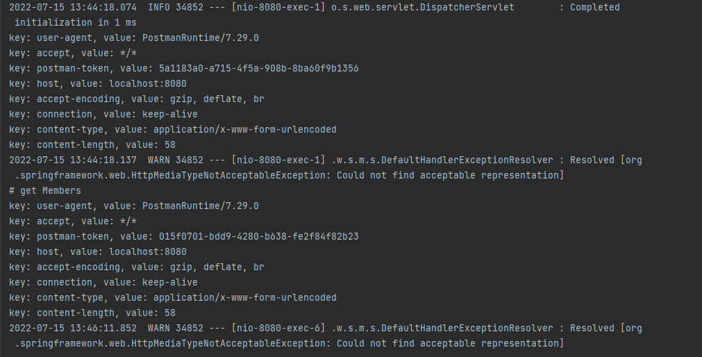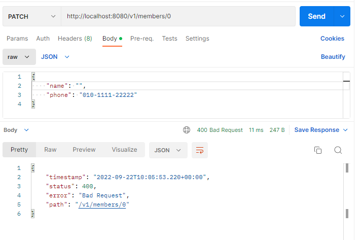 - 애플리케이션을 재시작하고 patchMember() 핸들러 메서드에 해당되는 URI로 요청을 전송하여 확인한다