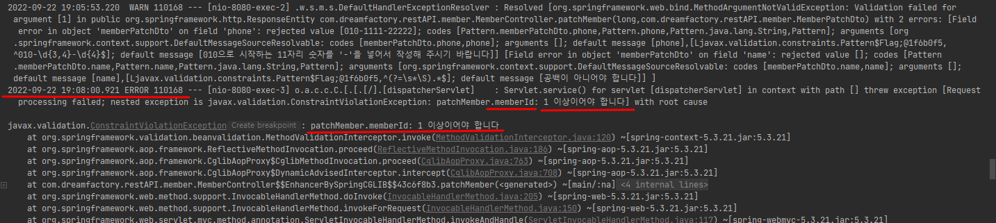 : 유효성 검증에 실패하면 내장된 디폴트 에러 메시지를 콘솔에 출력한다 - 요청으로 전달 받는 MemberPostDto 클래스의 각 멤버 변수에 유효성 검증을 위한 애너테이션을 추가하여 MemberController의 핸들러 메서드에 별도의 유효성 검증을 추가하지 않고 유효성 검증 로직을 분리하였다