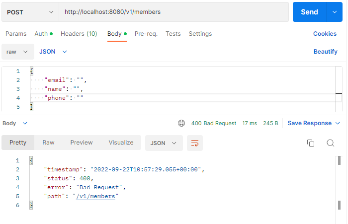 - @Request Body에 대한 유효성 검증 실패 메시지와 조금 다르지만 유효성 검증은 정상적으로 이루어진 것이다