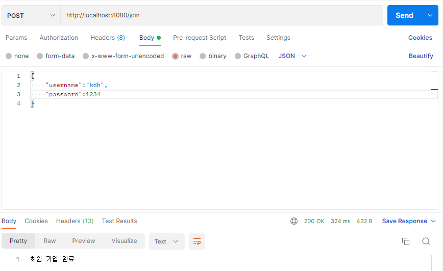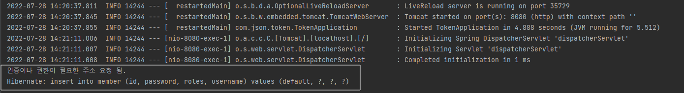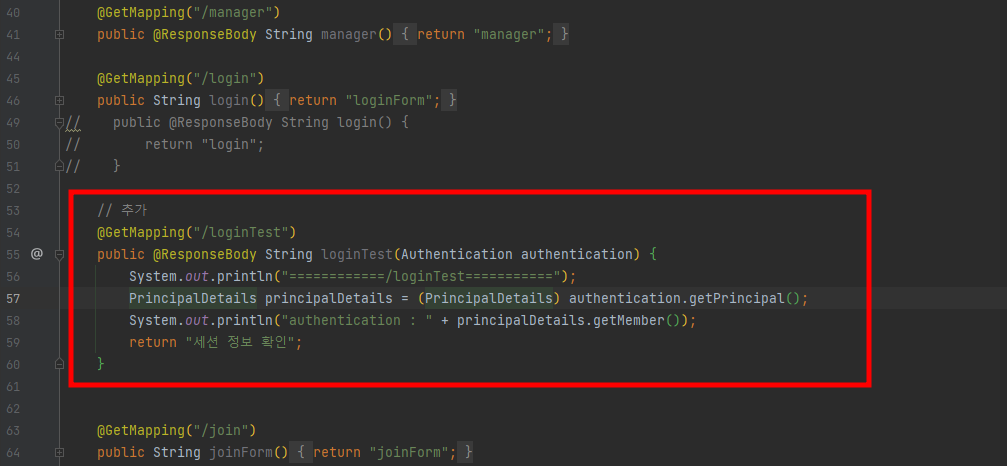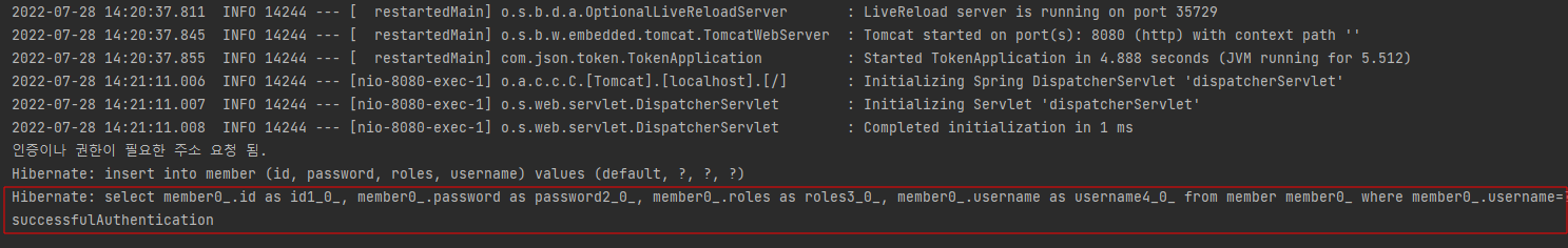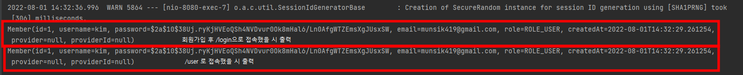 - 회원가입 → 로그인 후 /loginTest url로 접속해서 로그에 Authentication 정보를 확인합니다.
