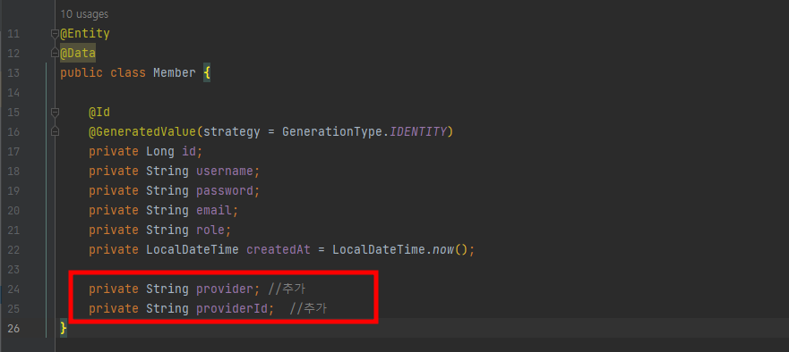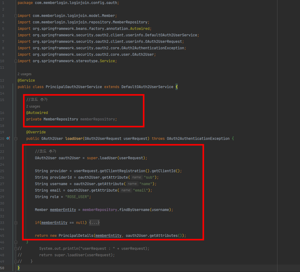 - 후처리 작업이 있는 PrincipalOauth2UserService 클래스의 코드를 수정한다