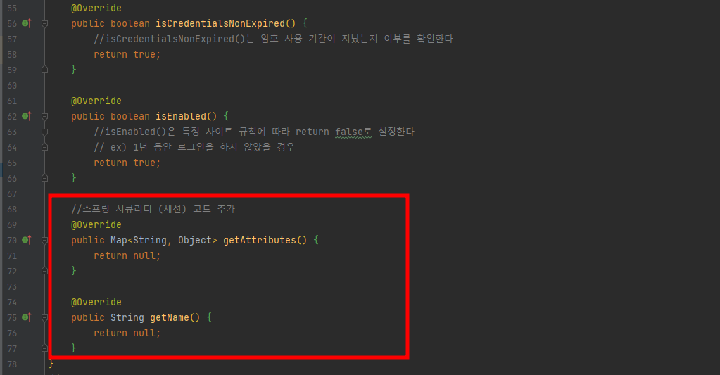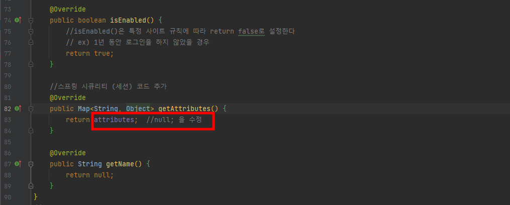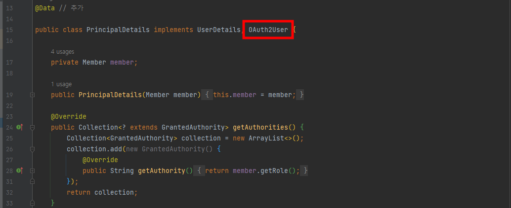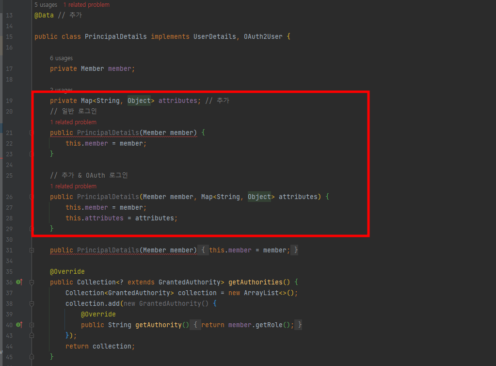 1) PrincipalDetails 클래스에 코드를 추가 및 수정한다