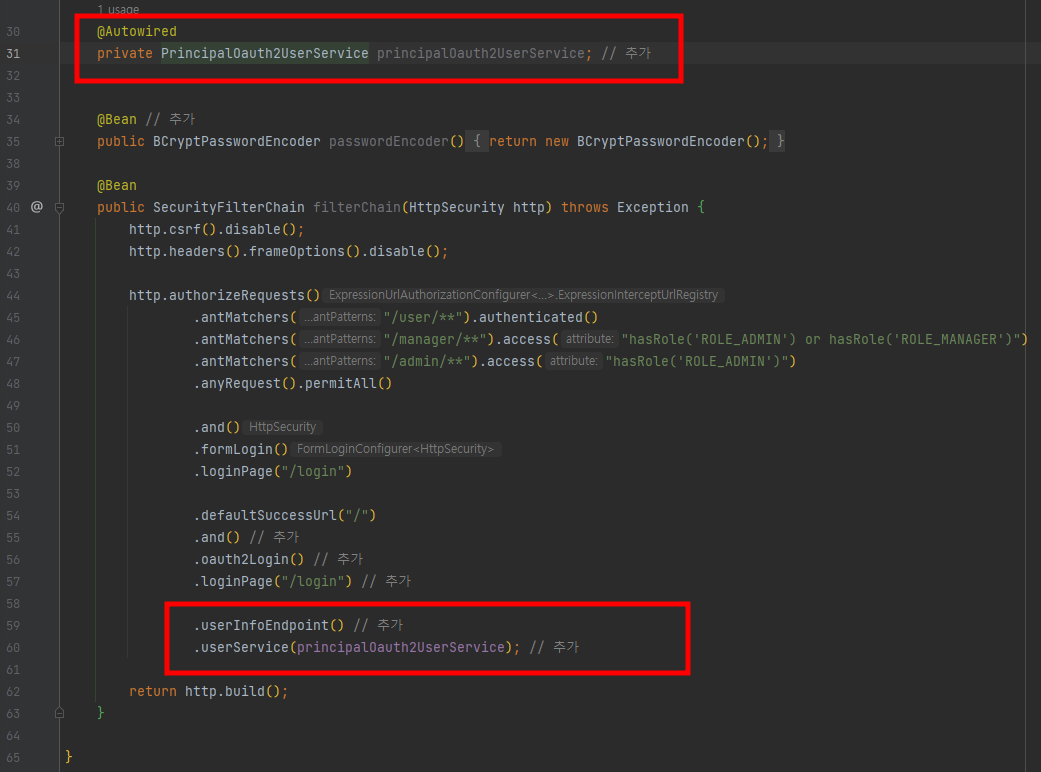 private PrincipalOauth2UserService principalOauth2UserService; // 추가