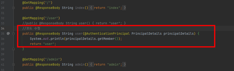 - Authentication 객체를 의존성 주입을 통해 다운 캐스팅하여 정보를 가져올 수 있다.