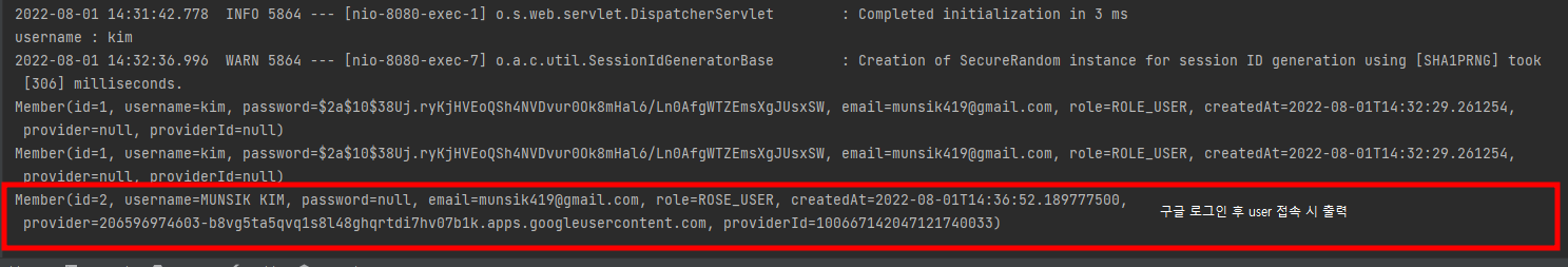 - 로그아웃 후 구글 로그인 → /user url 접속
