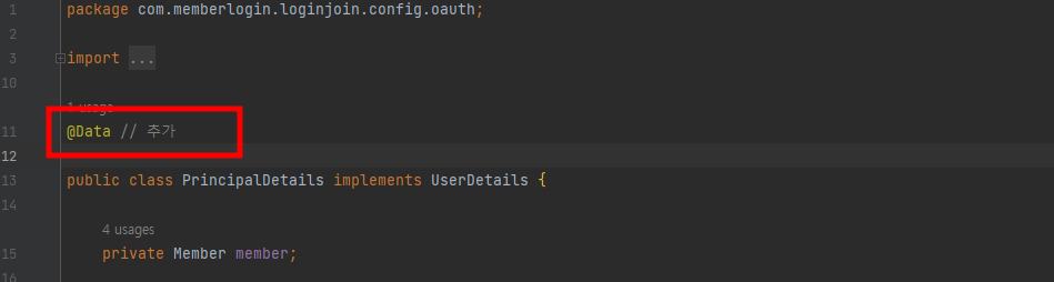 1) PrincipalDetails 클래스에 @Data 애너테이션을 추가한다
