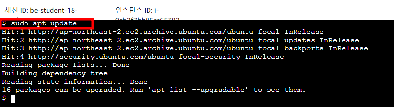 - EC2 인스턴스 연결에서 진행한 것과 같이 인스턴스를 연결한 터미널에 아래 명령어를 입력한다