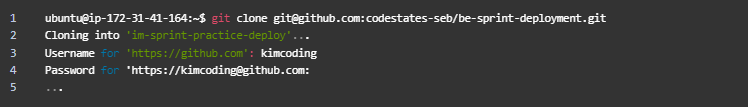 - git clone 명령어를 통해 EC2 인스턴스에 스프린트 코드를 클론 받는다