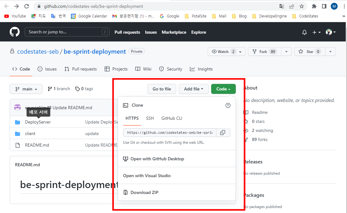 - 스프린트 코드가 저장된 깃헙 레포지토리 주소를 복사한다