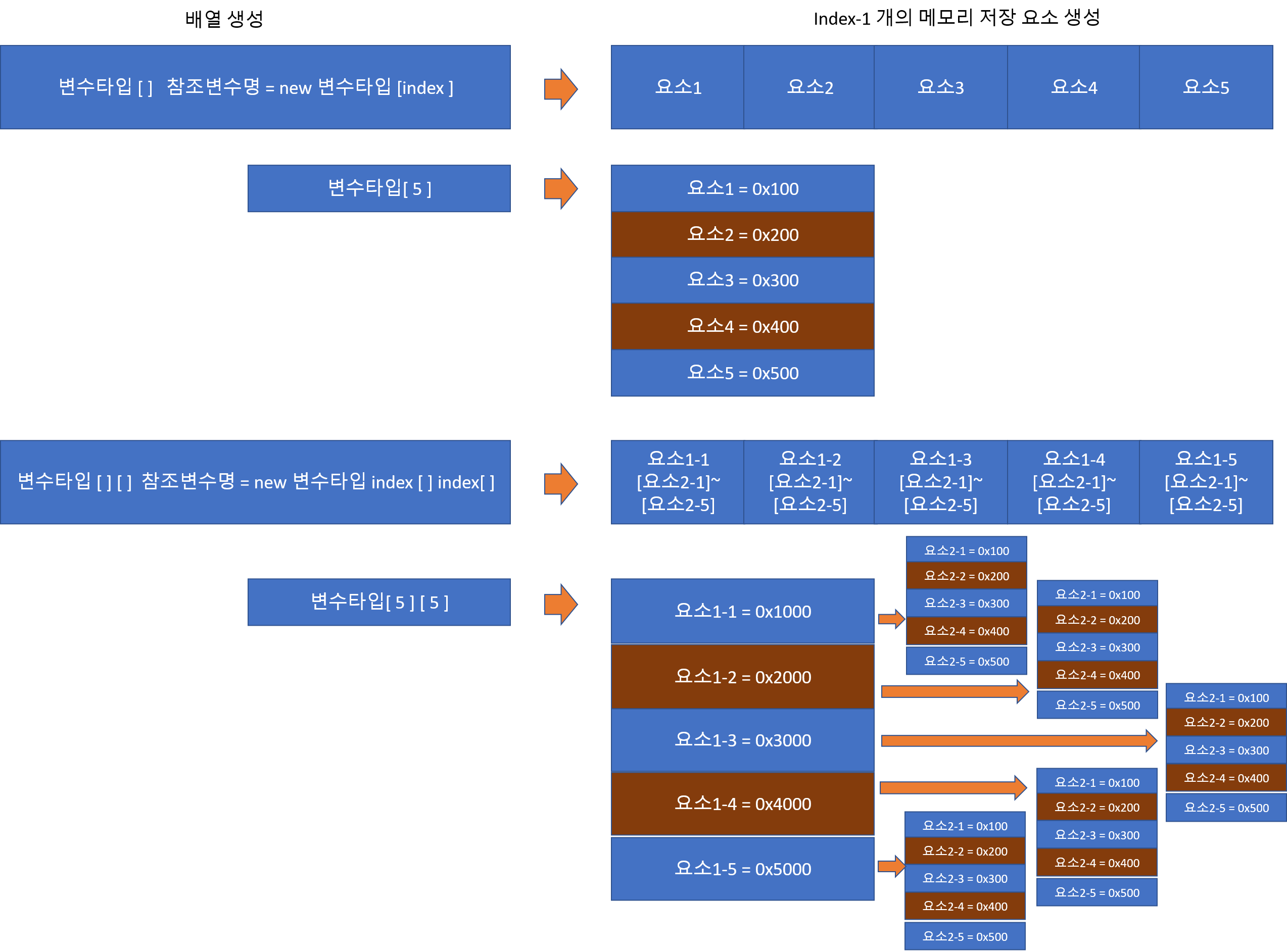 - 동일한 방식으로 반복되면 3차원, 4차원,...다차원 배열이 된다