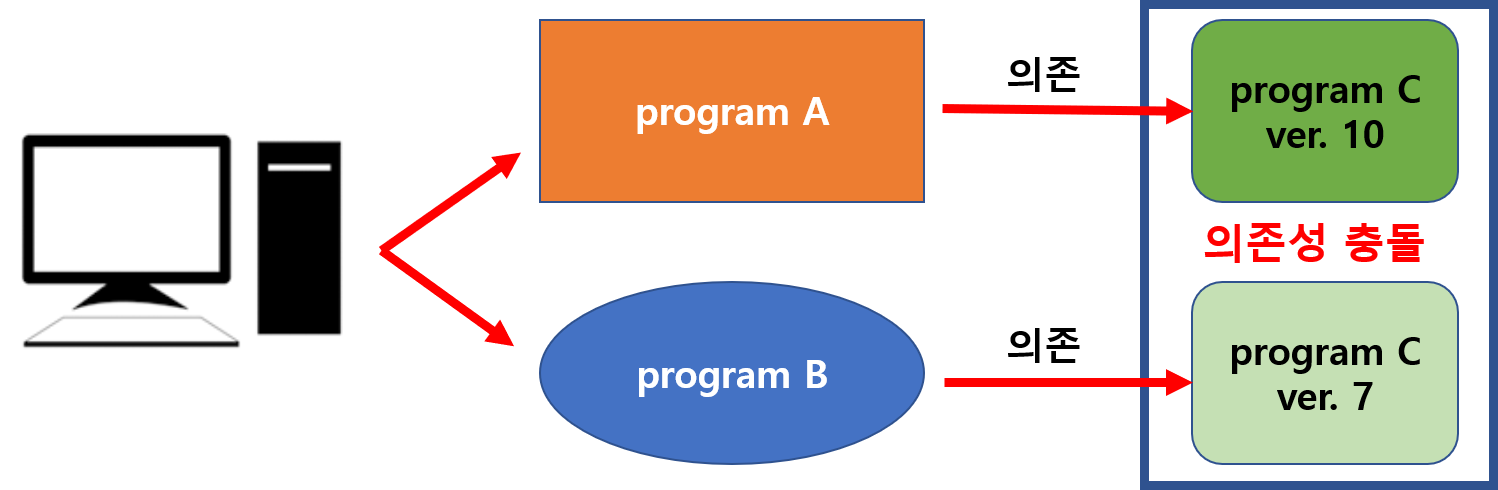- 프로그램(A) 실행에 프로그램(B)가 반드시 필요한 경우, '프로그램 A는 프로그램 B에 의존 관계를 가진다'고 한다 - 한 개의 컴퓨터에서 여러 개의 프로그램을 실행할 경우 의존성이 각각 다르면 충돌이 발생한다