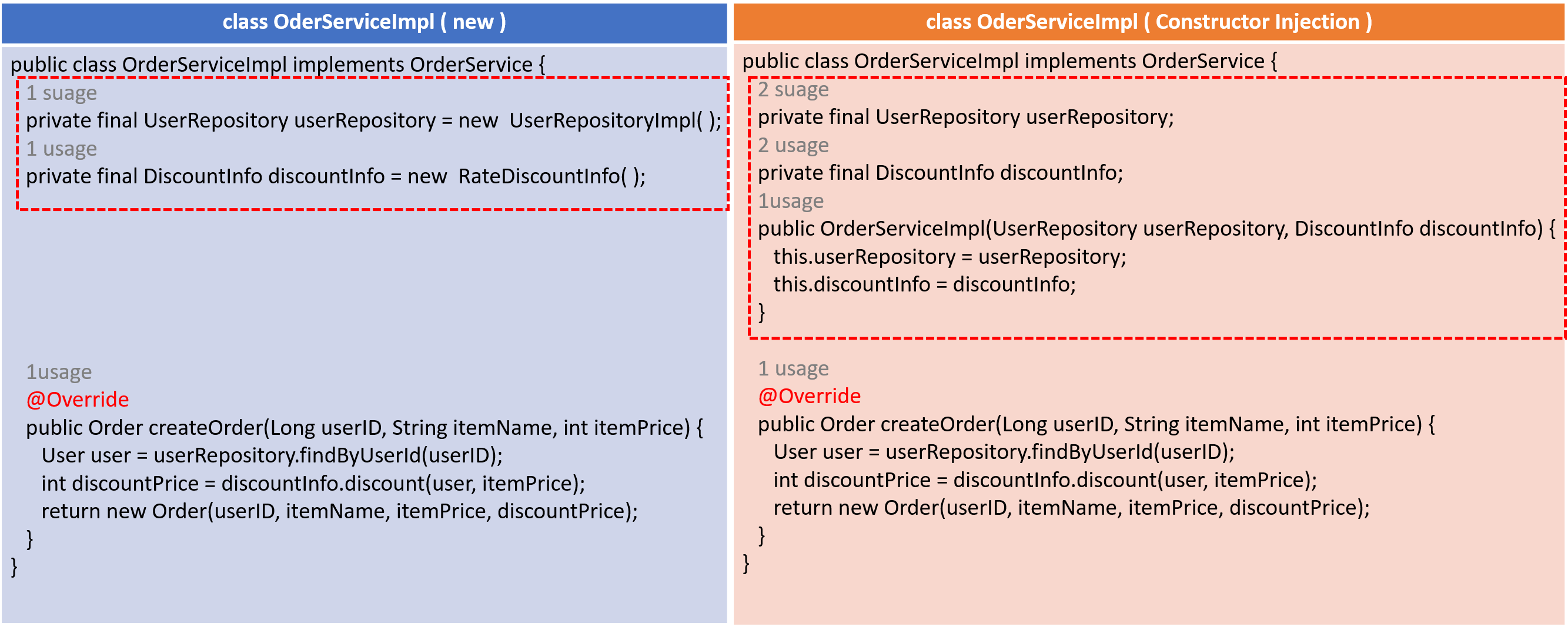 - new를 사용하는 대신 생성자를 통해 의존 객체가 주입되고, 느슨한 의존 관계가 이루어진다