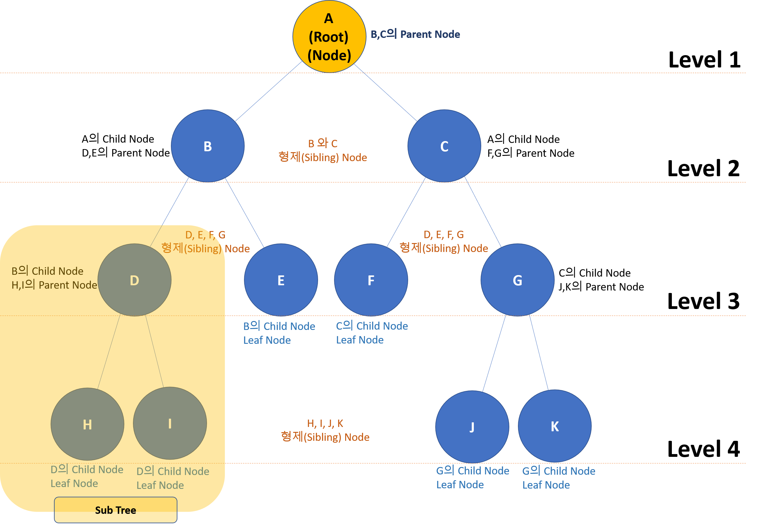 - 루트에서 뻗은 트리 구조 내에 트리구조를 가지는 작은 트리를 서브트리(Sub tree)라 한다